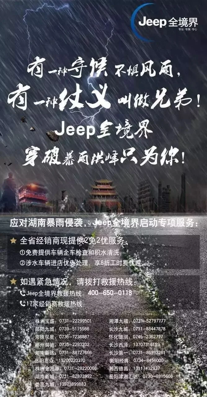 同时,广汽菲克作为车主坚强的后盾,针对湖南暴雨侵袭,启动Jeep全境界“二免两优”的专项服务,针对湖南省所有涉水车辆提供免费检查,免费积水清洗;并对涉水车辆提供进店优先处理及工时8折优惠。任何品牌车主如遇紧急情况,请随时拨打24小时救援热线400-650-0118联络救援。