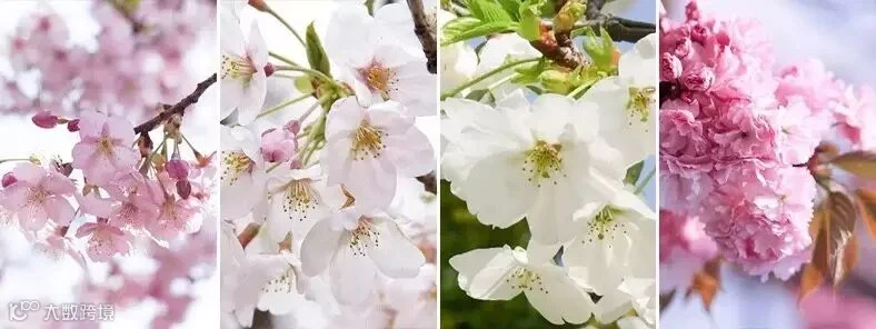 从左到右分别为:河津樱、染井吉野、大岛樱、关山樱
