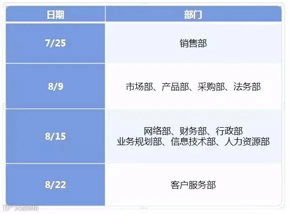 可素350多位小伙伴一起出去,队伍有点庞大啊,不造大家会不会羞涩~最后终于决定从7月到8月分部门进行四场团建活动。为了让大家对行程有所准备,下面是团建的日程安排。