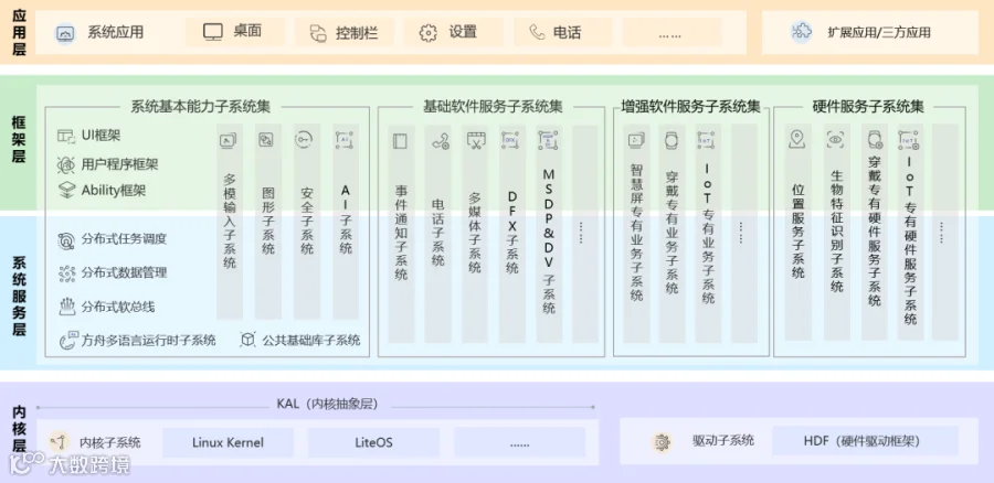 HarmonyOS整体遵从分层设计,从下向上依次为:内核层、系统服务层、框架层和应用层。