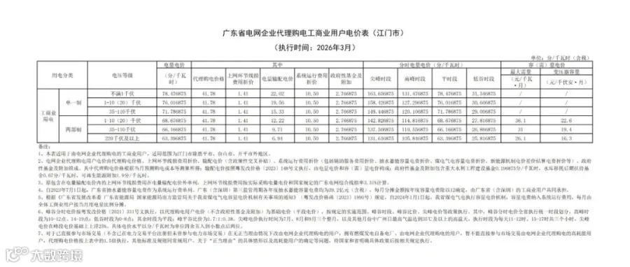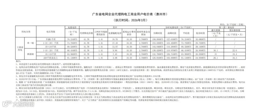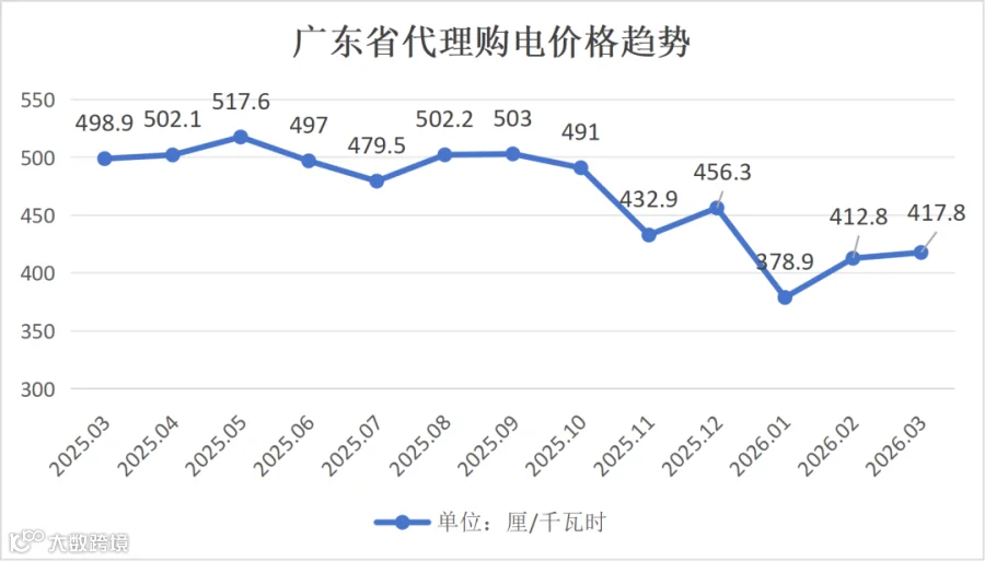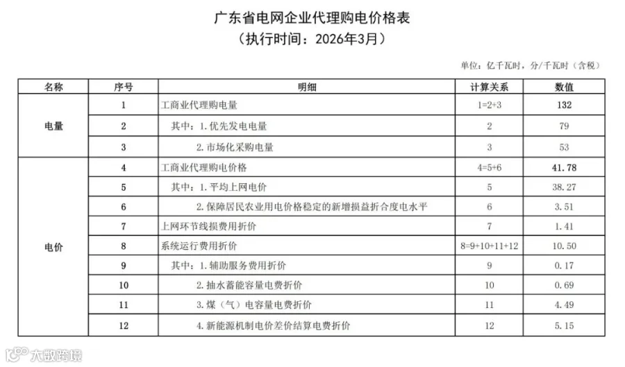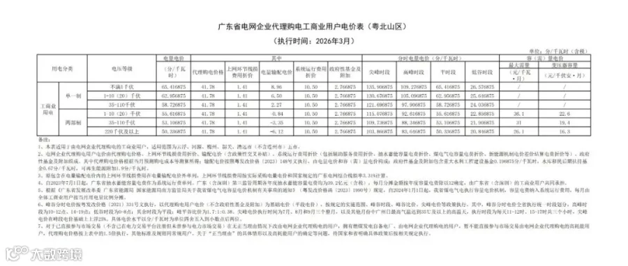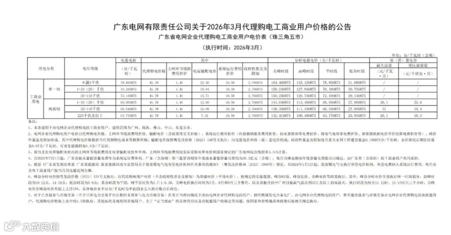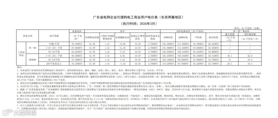 最近,广东电网有限责任公司公布2026年3月代理购电工商业用户电价——0.4178元 / 千瓦时,比今年2月(0.4128元/千瓦时)环比上涨 1.21%,还比去年3月(0.4989元/千瓦时)同比下降 16.26%。