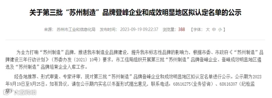 为全力打响“苏州制造”品牌,推进我市制造业品牌建设,提升我市标志性品牌的影响力,根据市委、市政府《“苏州制造”品牌建设三年行动计划》(苏委办发〔2021〕10号)要求,市工信局组织开展第三批“苏州制造”品牌登峰企业、登峰成效明显地区遴选及“苏州制造”品牌培育企业入库工作,经各地推荐、形式审查、专家评审,现对第三批“苏州制造”品牌登峰企业和成效明显地区拟认定名单进行公示。