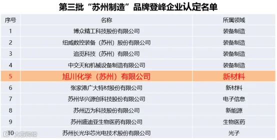 旭川化学(苏州)有限公司成功上榜第三批“苏州制造”品牌登峰企业名单,成为太仓市首家入围企业,实现了零突破,未来公司将继续深入推进“苏州制造”品牌建设,充分发挥“苏州制造”品牌登峰企业引领示范作用,积极打造“苏州制造”高端产品品牌,助推制造业高质量发展。