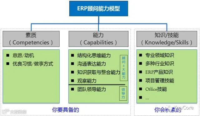 两人后续发展的差距在上面这段聊天中就拉开了。现任总经理的这位其实有整理一份顾问能力模型图(如下图),因此他能够将项目实际工作跟这个能力模型图做比对,将自己做得不到位的地方在能力模型图中找到对应的点(知道与高层对话、监督客户工作进度属于项目管理中干系人管理和进度管理的内容),从而有目的地找方法、途径去弥补(找一本项目管理的书系统学习)。