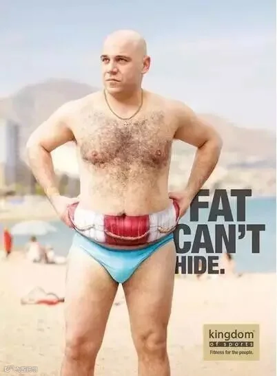 肥胖的躯体平躺在沙滩上,抬头远眺,辽阔的大海、炫美的夕阳、比基尼沙滩美女...都被你的大肚皮挡住,统统看不到!