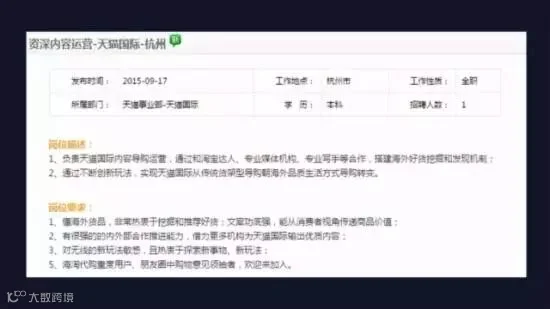 在搜索框输入“内容运营 天猫”,找到了一条发布于09月17日的天猫国际的资深内容运营岗。相比于在百度搜索到的那些入驻天猫的商家旗舰店的运营介绍来说,招聘官网上的岗位介绍算是能够客观的阐明天猫的内容运营工作了。
