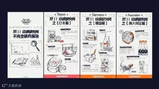 1)手绘。天猫在10月21-10月31日的10天里每天推荐一个特色国家主题,涵盖了各国家和地区的吃喝玩乐,并且在结束将11个国家的特色商品制作成手绘版的《双11环球研究所,不完全研究报告》