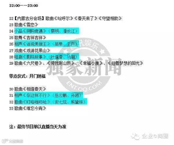 经过腾讯娱乐记者多方打探,还是独家得到了一份今晚的节目单。从腾讯娱乐记者手里拿到的节目单来看,春晚的节目共有四十个,语言类节目八个,另外还有杂技、武术等等。