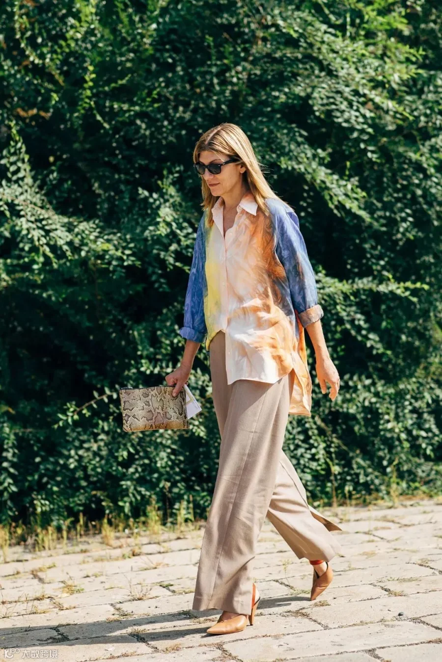 扎染是今年一大关键词,一件酷感十足的扎染衬衫,裤装换成轻松的米色或者其他沙漠色系,营造出轻巧大女人风格。