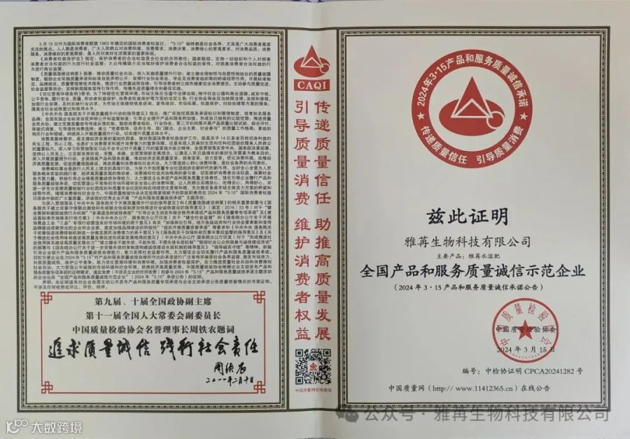近日,在由中国质量检验协会主办的2024年“3·15”国际消费者权益日“产品和服务质量诚信承诺”主题活动中,雅苒生物科技有限公司凭借卓越的产品质量,被授予“全国产品和服务质量诚信示范企业”荣誉称号。此次获奖,是对雅苒生物科技有限公司产品质和质量的高度肯定。