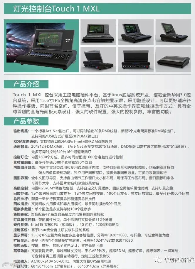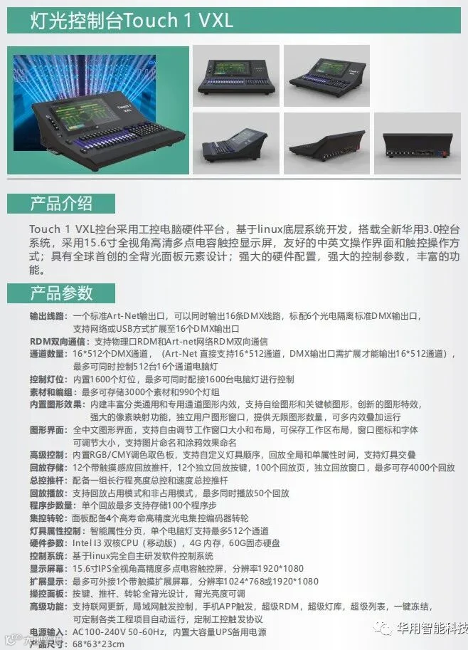 华用公司早在2017年1月即发布第一款控台Touch 1 Mini,是国内最早发布完全自主研发电脑系统触摸数字控台的厂家。经历了整整四年时间的不断开发和完善,到目前已经拥有10个型号的在售控台产品,且全部为自研电脑系统触摸数字控台。华用也是目前国内自研电脑系统触摸数字控台产品线最全,用户覆盖最广的公司!