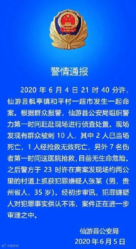 据福建仙游公安消息,6月4日21时左右,仙游县枫亭镇和平村一超市发生一起命案。现场发现有群众被刺10人,其中2人已当场死亡,1人经抢救无效死亡,另外7名伤者第一时间送医抢救,目前无生命危险。