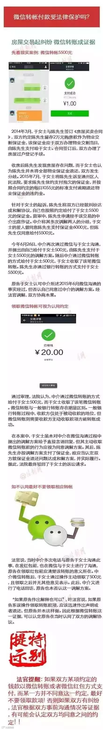 ②如不认同约定最好不要领取相应转帐……特别提醒:如果双方某项约定的钱款以微信转账或者微信红包方式支付,而某一方并不同意这一约定,最好不要领取款项。否则若双方有纠纷,可能会被认定双方均同意之间的约定。