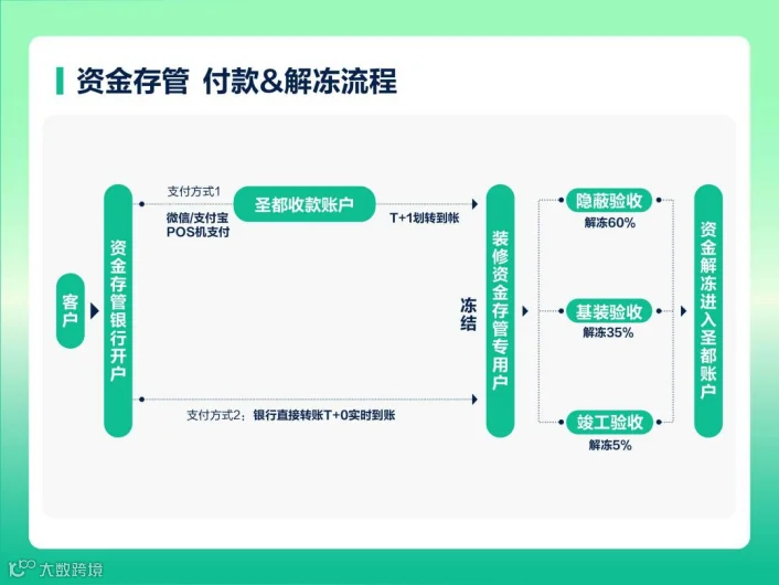 不同于传统“先付款后施工” 模式,圣都整装创新实行 “资金存管 + 节点验收” 机制:消费者在中信银行开户后,按签约、中期验收两个阶段,通过微信、支付宝或POS 机分笔支付款项,资金先存入存管专户并自动冻结,仅在隐蔽工程验收、基装验收、竣工验收三大关键节点完成后,分别解冻 60%、35%、5% 至企业账户。
