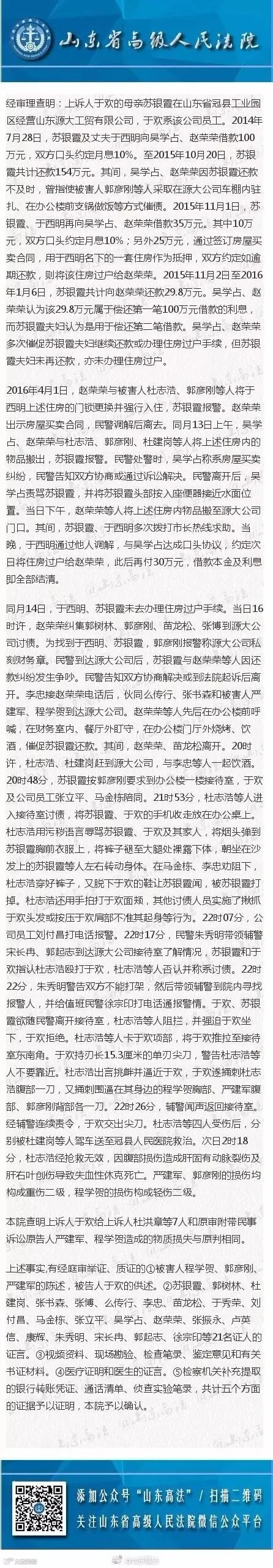 2016年4月,山东源大工贸负责人苏银霞及其子于欢,被11名催债人限制人身自由并受到侮辱。于欢刺伤4人,其中1人死亡。聊城市中级人民法院于2017年2月17日作出一审判决。于欢一审被以故意伤害罪判处无期徒刑。宣判后,被告人于欢、附带民事诉讼原告人杜洪章、许喜灵、李新新等人不服,提出上诉。山东省高级人民法院于2017年3月24日受理该案。