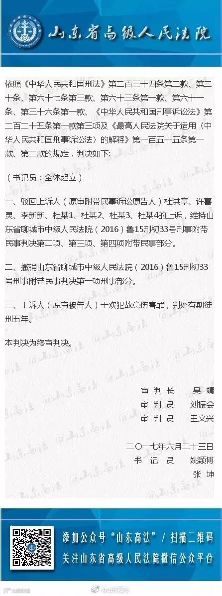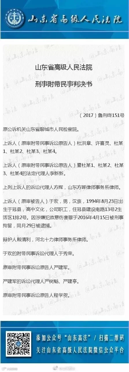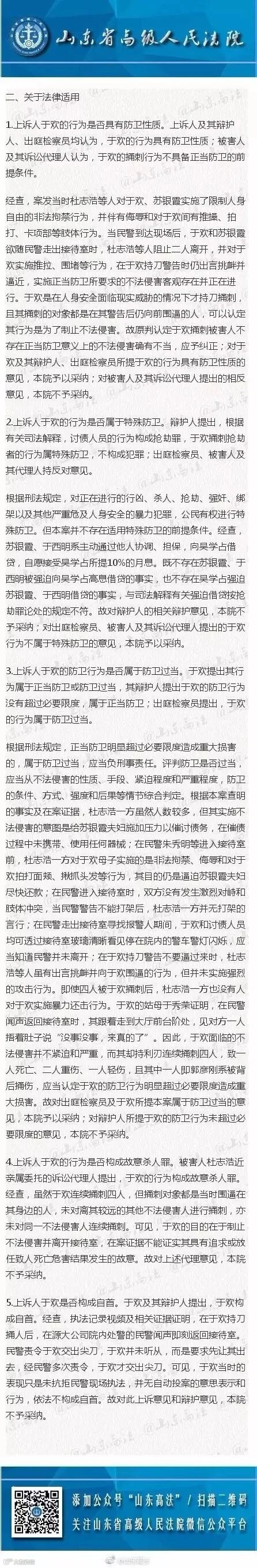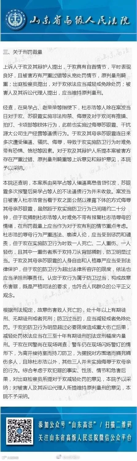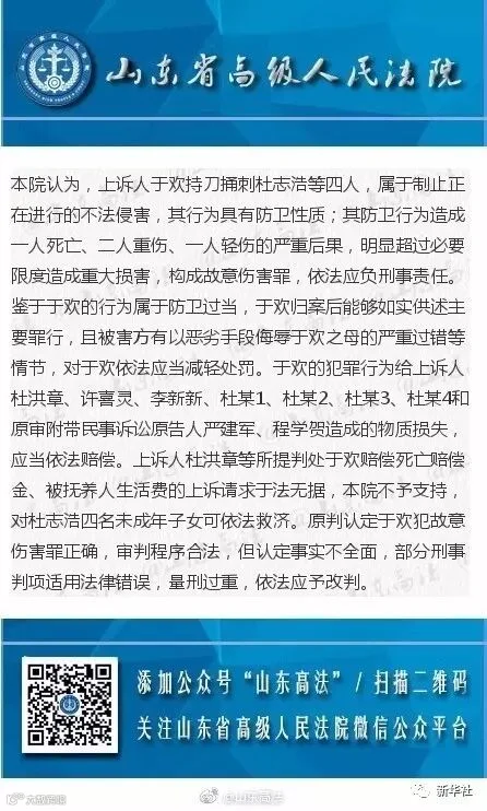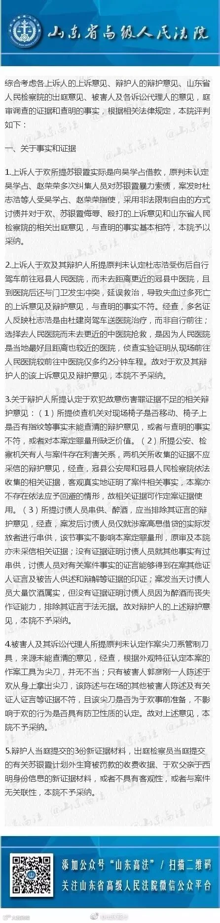 今天上午9:00 ,山东省高级人民法院对于欢案作出二审判决,认定:
