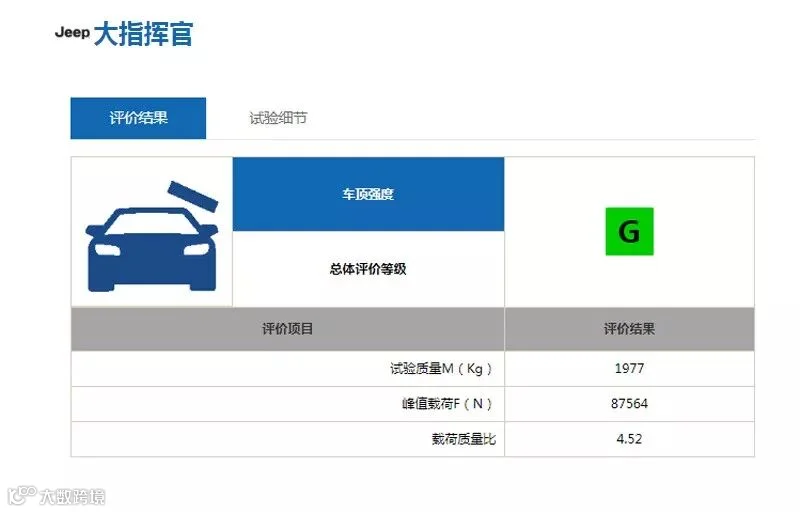 尤其需要指出的是,在车顶承受4.52倍车重的压力后,侧前门的玻璃甚至没有崩碎;按国家标准要求,大指挥官的车重接近2吨,在加载1.5倍车重也就是3吨力时,车顶变形小于127mm就算合格。而实际上大指挥官在加载力达到10吨时,变形量仍能小于127mm,达到国内标准4倍以上。Jeep大指挥官车身上290MPa到980MPa的高强度钢比例达到了76%,其中1500MPa以上强度的热成型钢达到了13%(同级别车型通常<10%或不采用),相当于指甲盖大小的面积上承受13吨的压力。这是对Jeep的SAFETY CAGE安全笼式车身理念的一次成功检验。