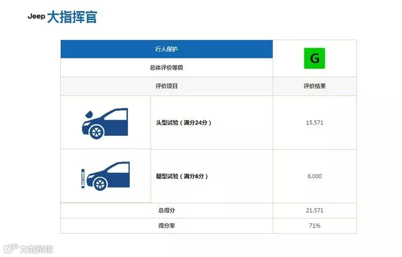 车外行人安全和车辆辅助安全指数两个大项目的成绩都是G优秀。行人保护方面,大指挥官在另一个碰撞标准——C-NCAP中也获得过好成绩。