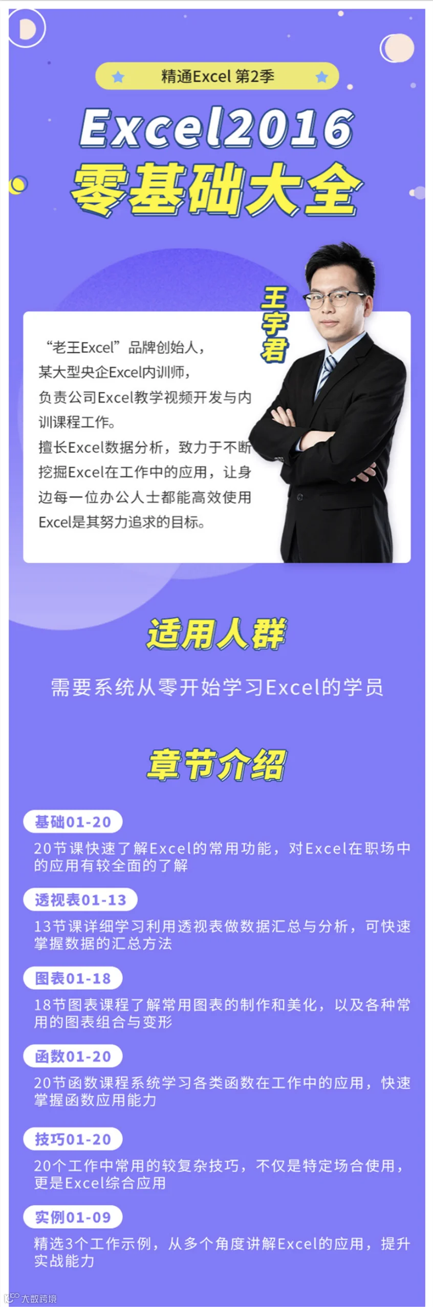 创骐云课堂邀请了“老王Excel”品牌创始人王宇君老师,给大家讲解Excel中最常用到的技能和干货,总共145节干货课程,为你讲透、讲明白Excel的使用技巧。