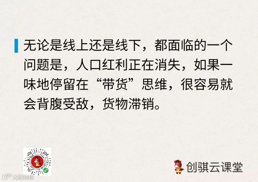 如今,无论是线上还是线下,都面临的一个问题是,人口红利正在消失,如果一味地停留在“带货”思维,很容易就会背腹受敌,货物滞销。