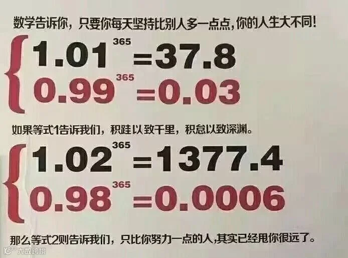 一年的光阴,努力一点点取得的成就为37.8,退步一点点的成绩为0.03,努力是退步的1260倍!
