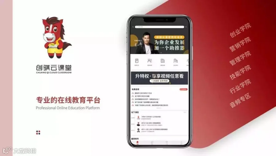 创骐云课堂APP致力于打造企业知识系统孵化器,融合百位名师优质资源,汇聚业界管理专家、品牌营销大师、职场名讲师等优质人才的塔尖智慧,为企业高管和团队成员搭建深度垂直领域知识学习平台,有助于企业和个人拓展商界职场视野,目前已触达千万用户,极大地解决企业的管理和培训痛点。