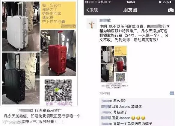 在朋友圈或者论坛有时能看到免费送东西的广告,小到水杯、运动手环,大到行李箱、苹果手机,只要添加对方微信好友就可以免费送。