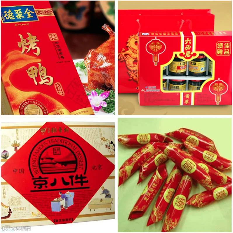劲柯:最有名的当属全聚德烤鸭,一般用来走家串户送年礼;还有稻香村的糕点和大虾酥酥糖,其中红虾酥糖是最爱。当然也少不了六必居酱菜和各种糖果花生瓜子等。