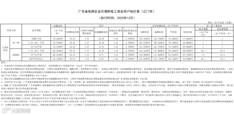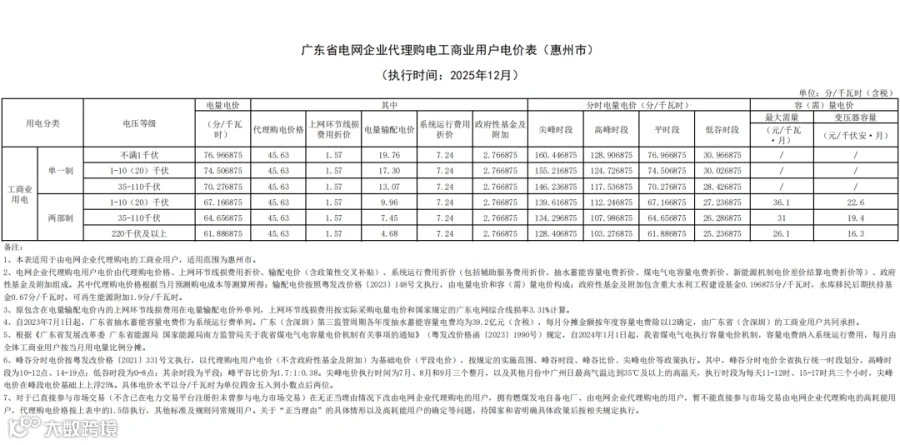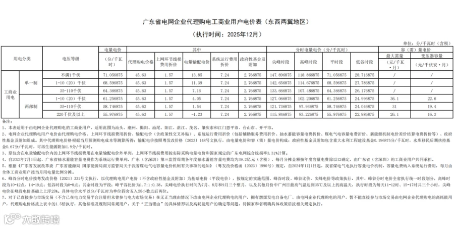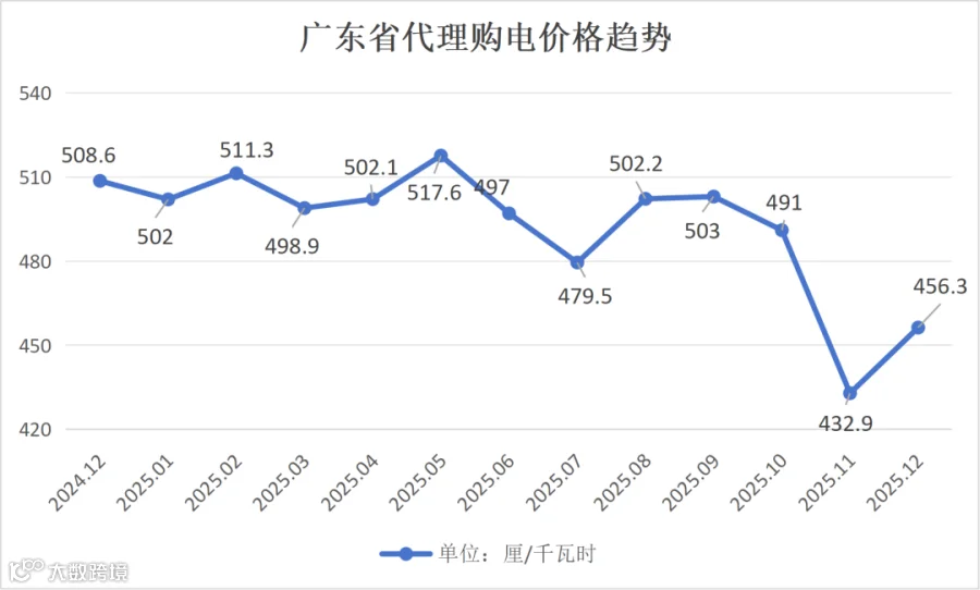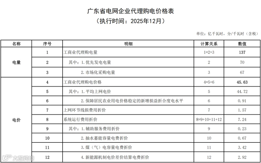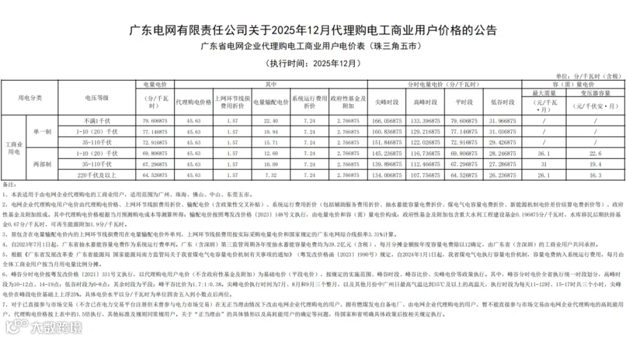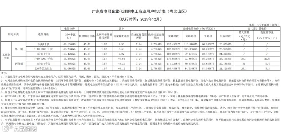 近日,广东电网有限责任公司公布2025年12月代理购电工商业用户电价——0.4563元 / 千瓦时,比今年11月(0.4329元/千瓦时)环比上升约 5.41%,还比去年12月(0.5086元/千瓦时)同比下降约 10.28%。