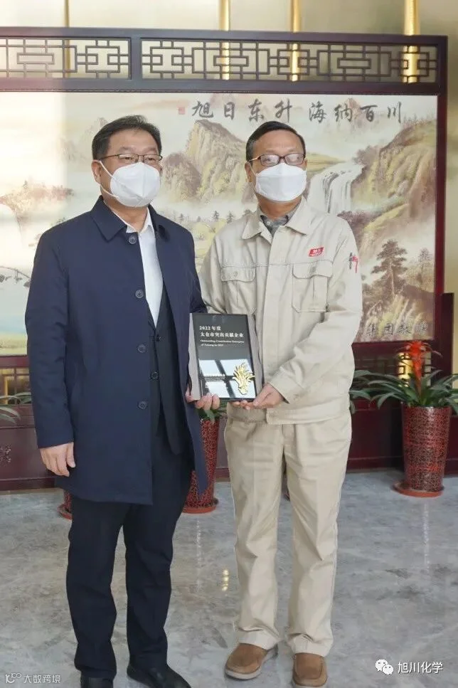 走访中胡卫江市长向旭川化学颁发了“2022年度太仓市突出贡献企业”奖,肯定了旭川化学在2022年度为社会经济、社会责任做出的突出贡献,并致以新年的问候和祝福。
