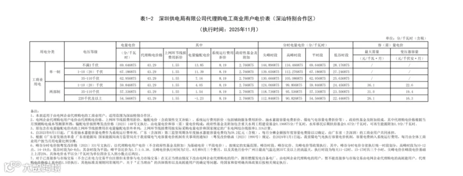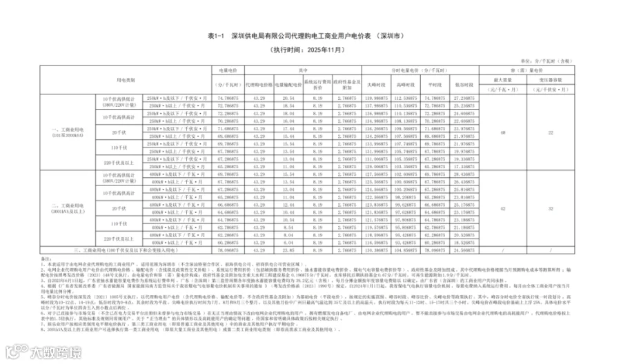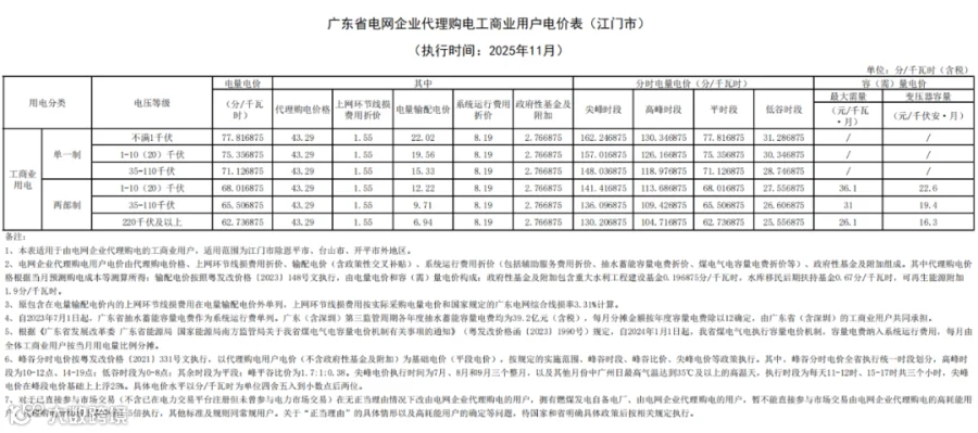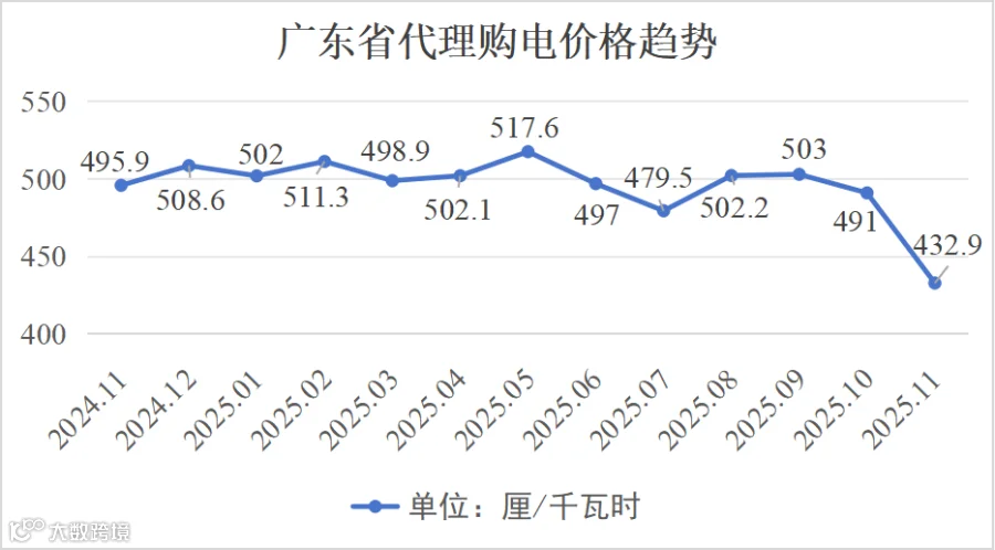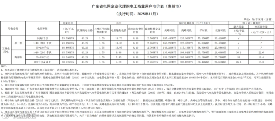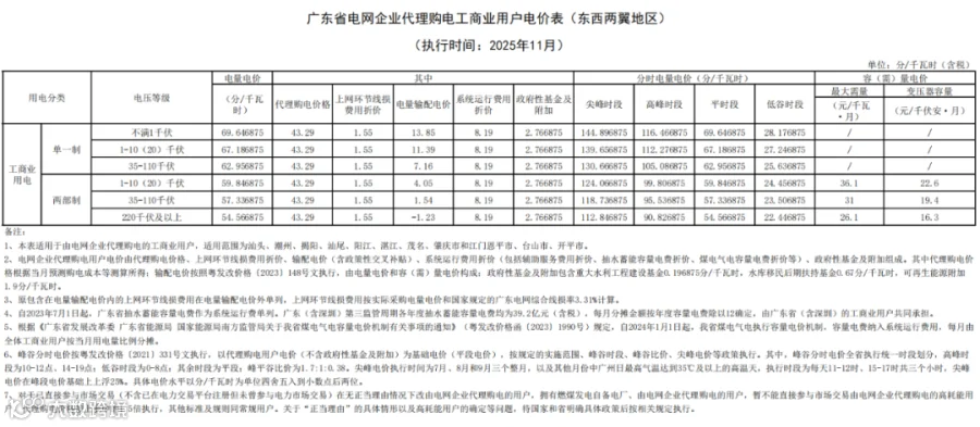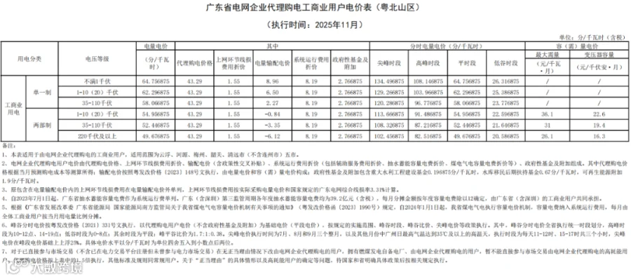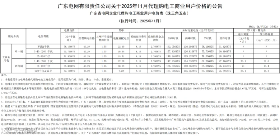 最近,广东电网有限责任公司公布2025 年11月代理购电工商业用户电价——0.4329元 / 千瓦时,比今年10月(0.491元/千瓦时)环比下降约 11.8%,还比去年11月(0.4959元/千瓦时)同比降约 12.7%。