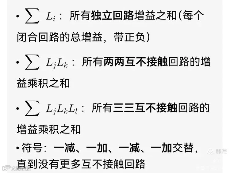 回路的影响:反馈回路会产生叠加、抵消、自激,用正Δ统一描述所有回路的组合效应