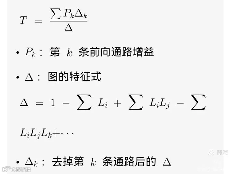 叠加原理:总增益=各通路贡献(PkΔk)之和,除以所有回路的总效应Δ