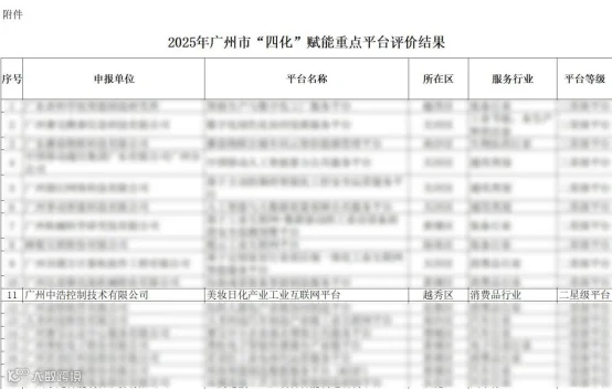 在最新公布的2025年广州市“四化”赋能重点平台评价结果中,广州中浩控制技术有限公司荣膺二星级平台认定,成为美妆日化领域评级最高的工业互联网平台。