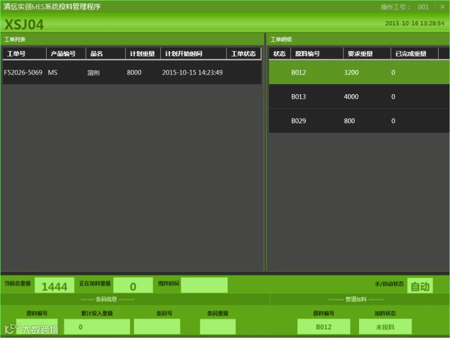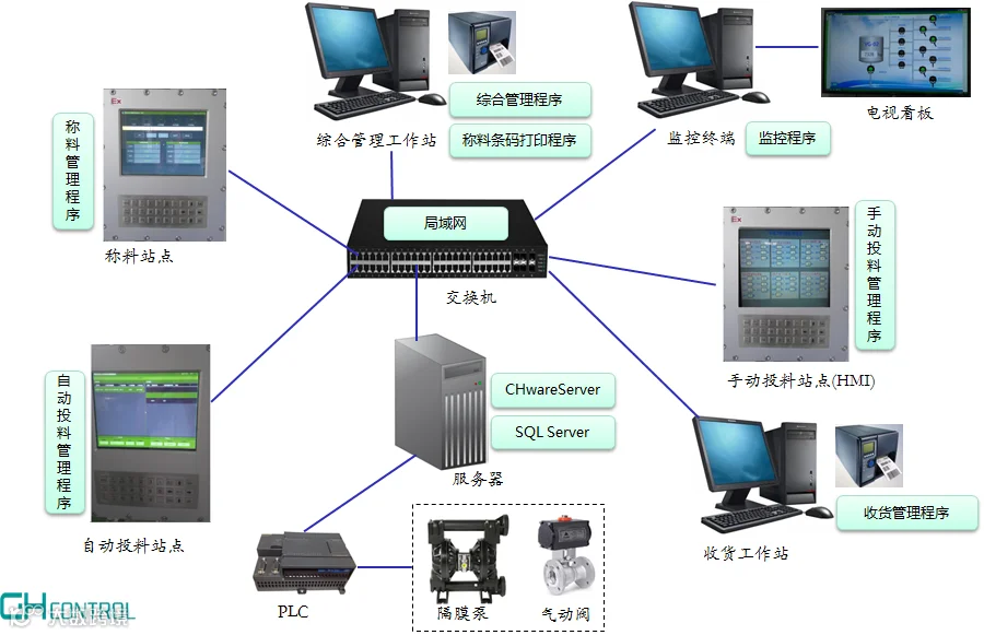 中浩公司为清远市实创涂料科技有限公司建立的一个全方位覆盖生产车间的智能生产管控系统,它通过实时信息采集、信息集成和配制管理,进行生产过程与活动监控管理,使生产作业符合计划进度需求,有效提高生产率和产品质量、降低库存和次品率、完善生产管理和客户响应速度,使生产过程得以优化并进行有效的监控管理,为生产企业对市场提供定制化服务提供有力支持。主要实现对生产过程进行管理、跟踪和管控,包括配方管理、原料仓库收货、原料称取、生产车间投料管理、罐区管道自动加料和生产现场监控。