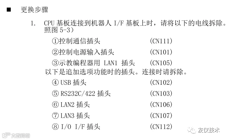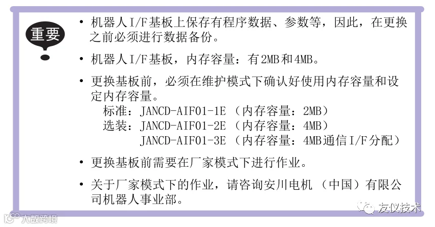 导读:点击蓝字,关注我们注意事项01CPU单元的零部件更换流程02机器人I/F基板(JANCD-AIF01)的更换