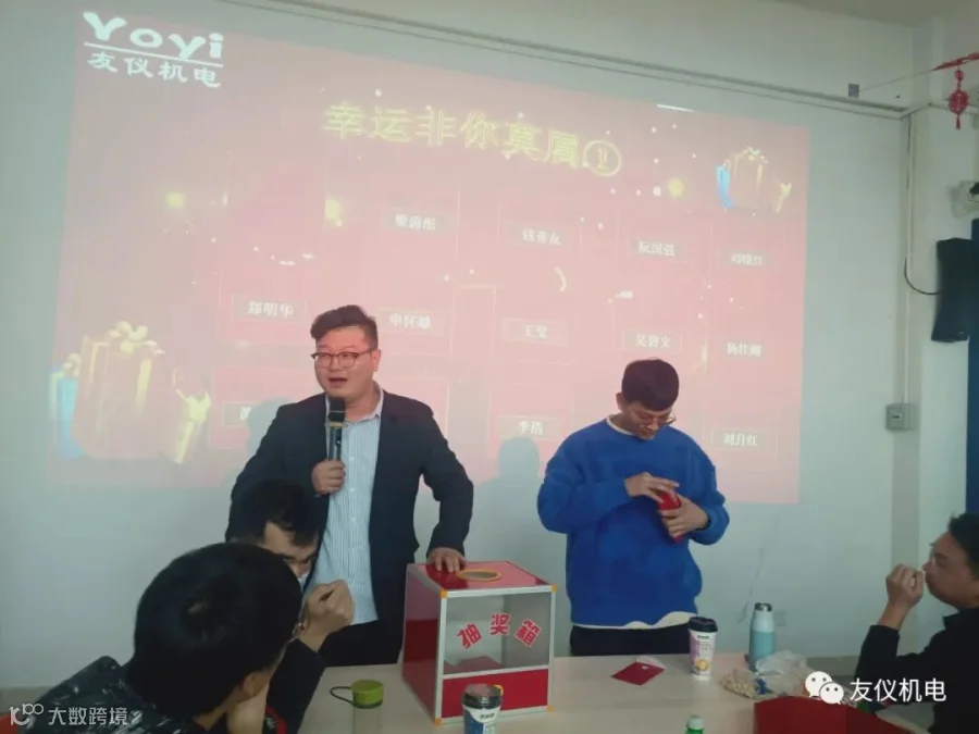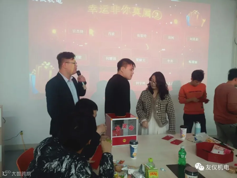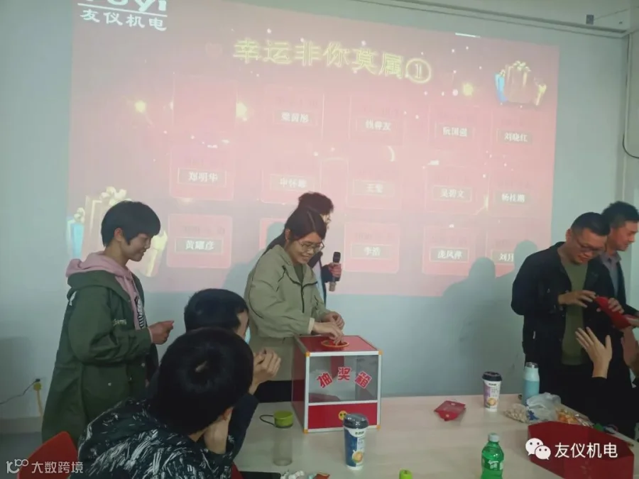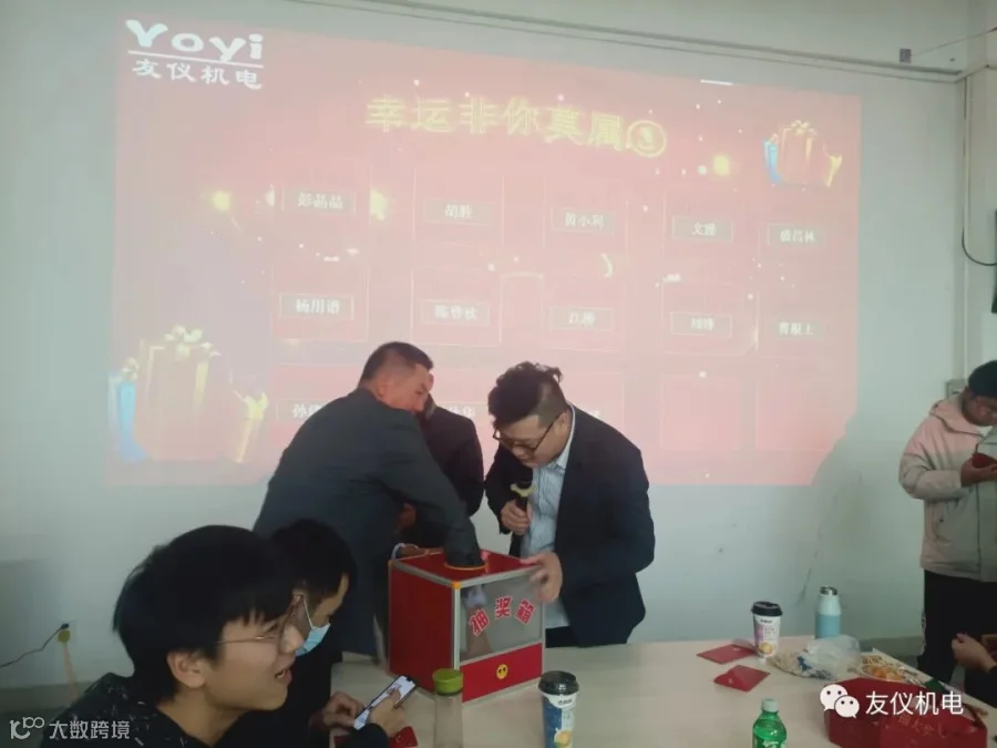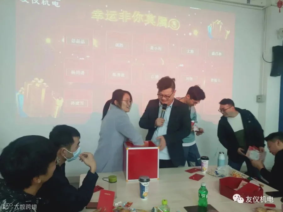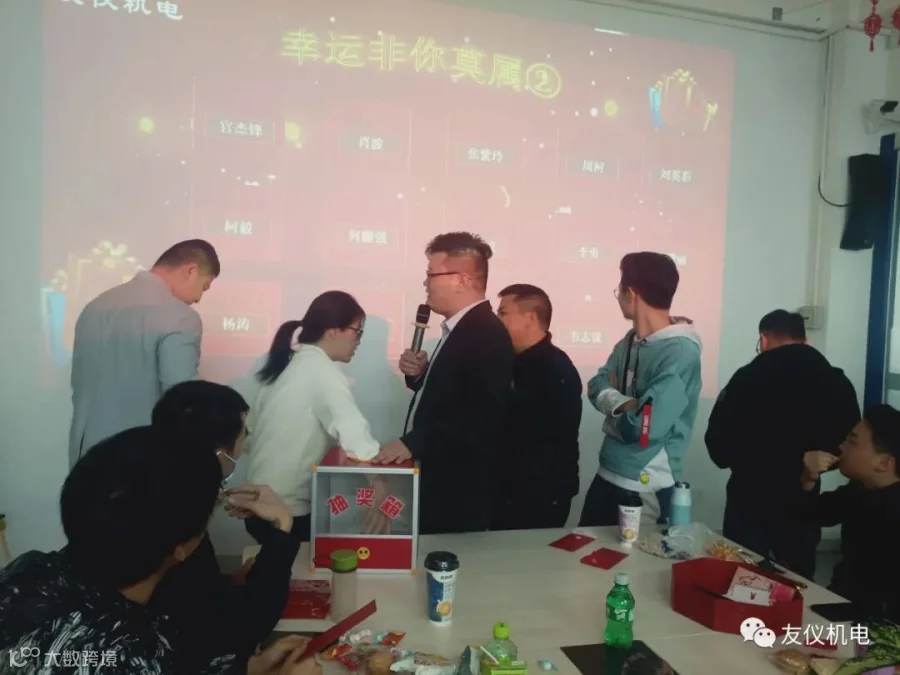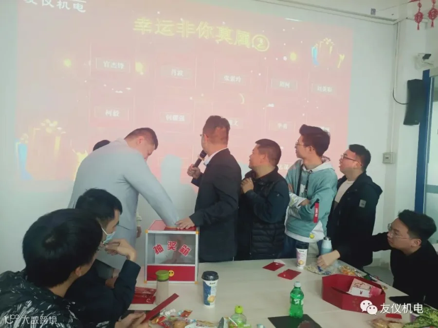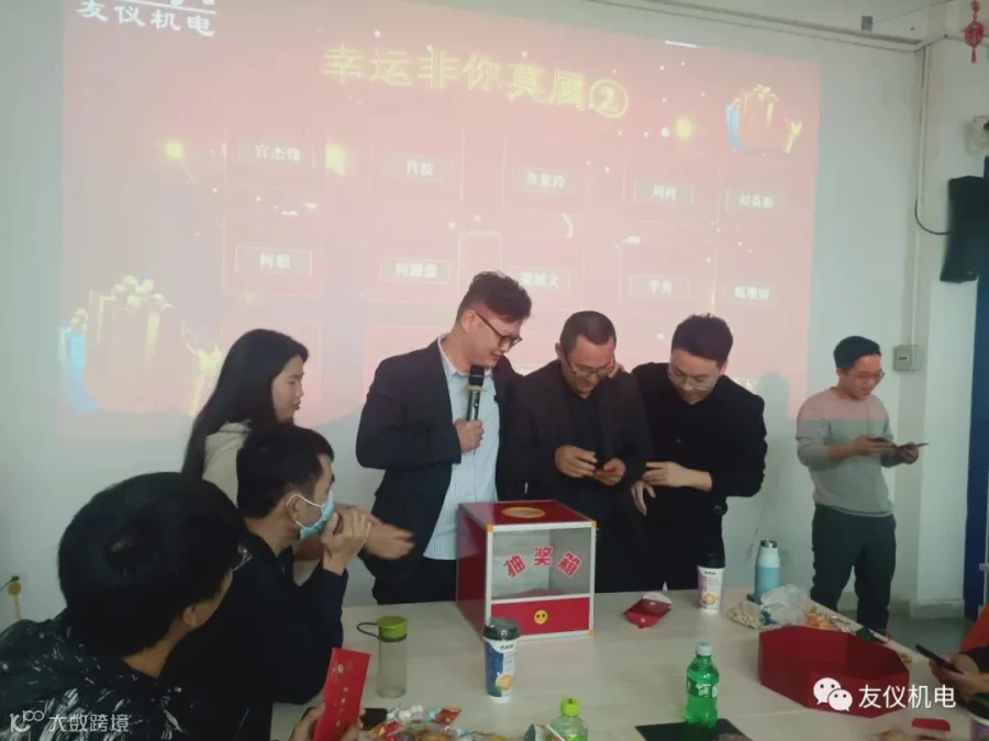 2021年终总结大会结束后,2022迎新年会缓缓拉开序幕。全体员工相聚一堂,欢声笑语辞旧岁,觥筹交错贺新年。一起玩游戏,一起抽奖。友仪人仰着灿烂的笑脸,生动地诠释着“奋斗青春”四字。每个人都积极投入,与团队并肩作战,为摘取胜利果实而努力。
