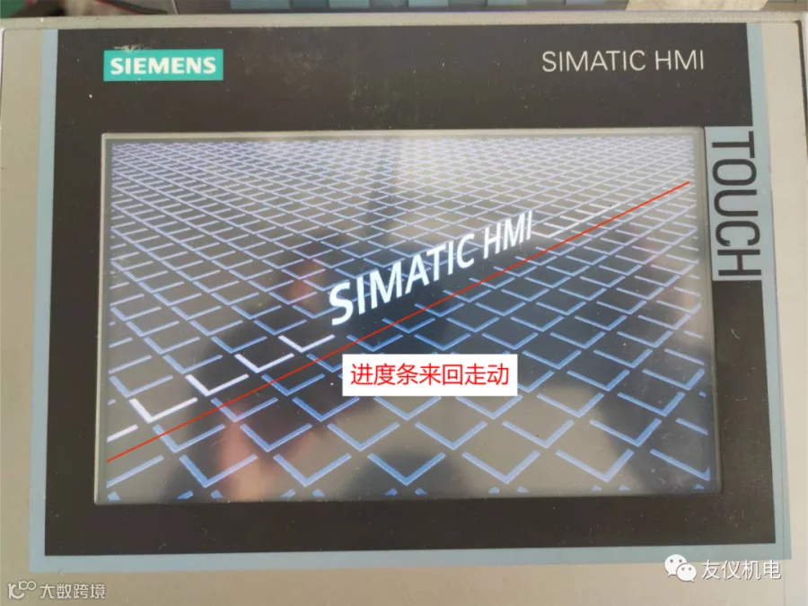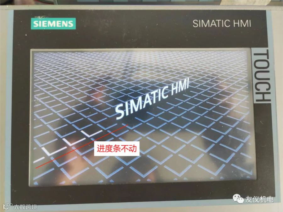 故障⑥:当西门子精智面板出现下面的这个界面,进度条走到右边第四个便不会再动,这种情况可以判定是机子的主板故障,CPU损坏。这种情况修复后会丢失程序。