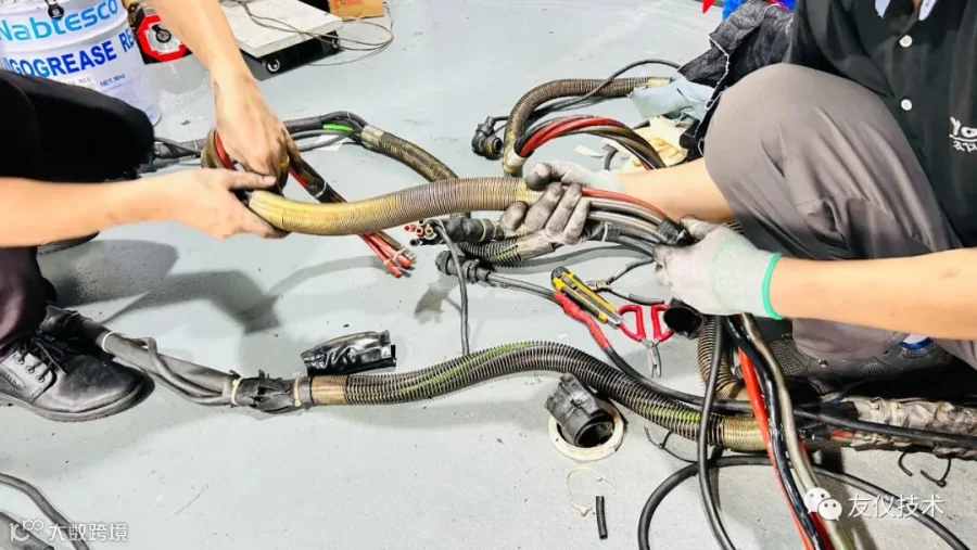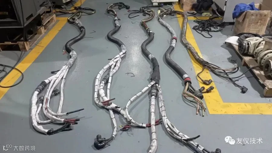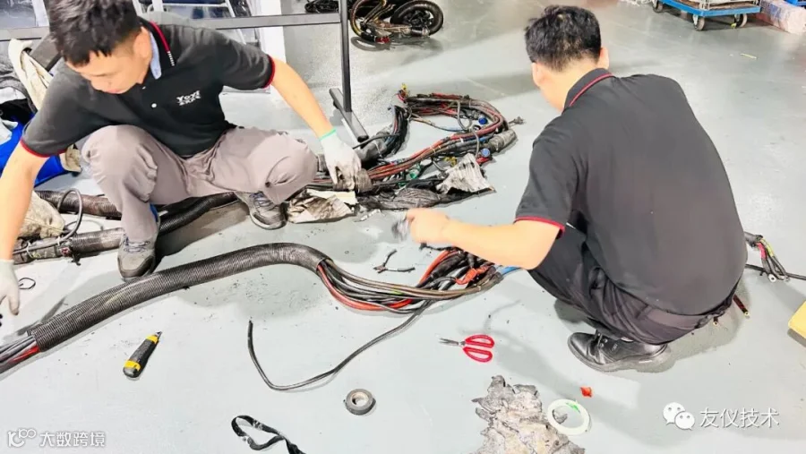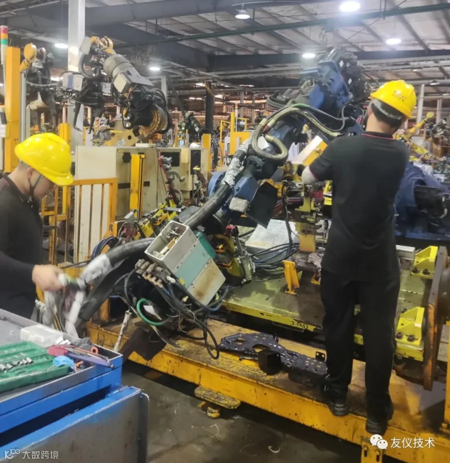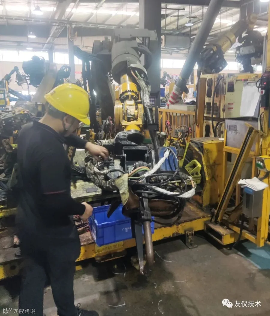 近期,我们维修了一批安川ES165工业焊接机器人管线包,遇到了各种问题,包括起包的、破皮的、断裂的、接头损坏的,甚至临时外挂一条以维持机器人运行的状况。为减少产线停机时间,我们兵分两路,一边拆装,一边维修,日夜不休,整个过程展示了友仪技术对工业机器人维修技能的挑战性和友仪“务实创新,共赢发展”的服务价值观。