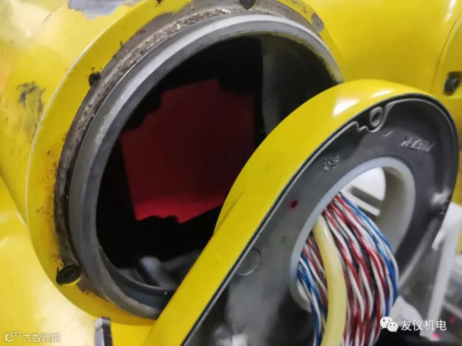 据客户详细描述“点动只能往一个方向而且有抖动现象,往另一个方向就会报警SRVO-050,然后卡死报警SRVO-046无法消除”,通过与现场技术人员详细沟通,我公司机器人服务事业部发那科机器人维修工程师快速做出判断:二轴电机或减速机故障。