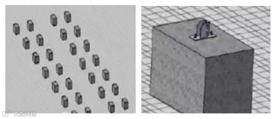 混凝土屋面上放置预浇矩形基础,适合屋面承载小、风荷载小的地区和屋面;矩形基础上预制标准化的固定连接件。