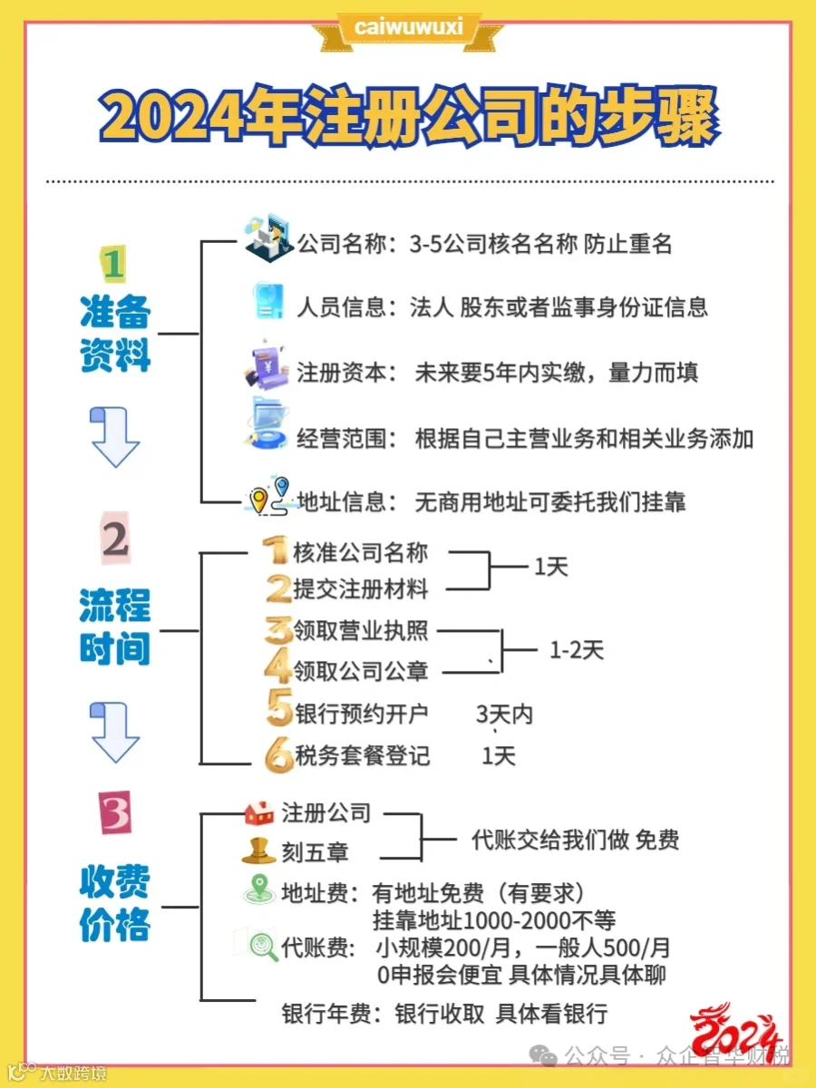 8.税务登记:执照下来后30天内做好税务登记和税务套餐),广州现在都是全电发票,税务套餐做好就可以开票了。代理记账费用:1500—2400(需要看开票情况)