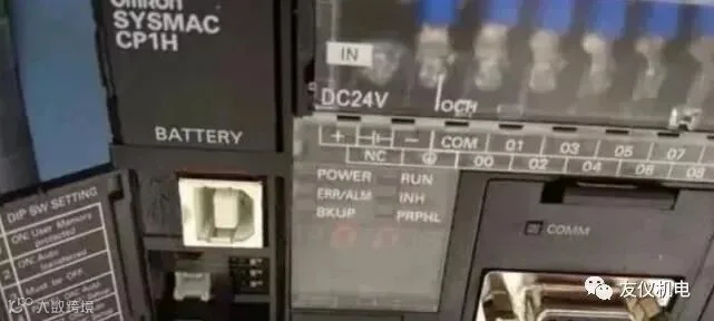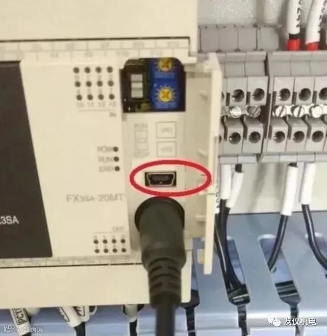 三菱FX3系列PLC,看红色圆圈部分的接口,很多工控产品都是此种接口。几乎所有的触摸屏都是此下载接口。