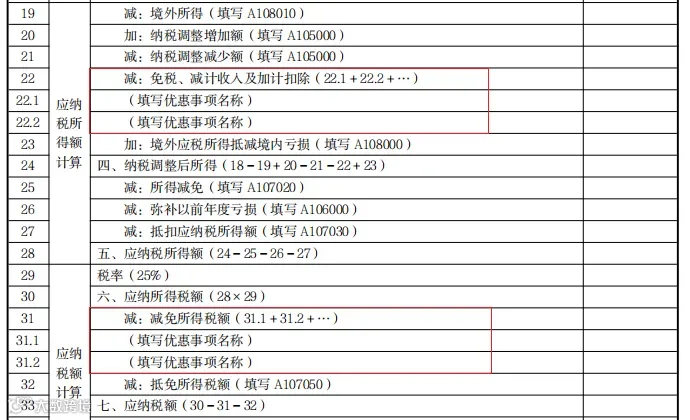 纳税人根据《企业所得税申报事项目录》,在第22.1行、第22.2行……填报税收规定的免税收入、减计收入、加计扣除等优惠事项的具体名称和本年累计金额。发生多项且根据税收规定可以同时享受的优惠事项,可以增加行次,但每个事项仅能填报一次。