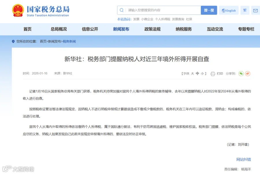 据新华社1月16日报道,税务部门已针对近三年境外所得纳税情况开展宣传辅导与风险提示,明确提醒纳税人对2022年至2024年期间从境外取得的收入开展自查补正,重申居民个人需依法就境内外全部所得缴纳个人所得税。