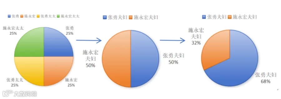 随着企业不断壮大,没有拿过1分钱的张勇认为企业要想发展,就需要一个经理,他提议自己当经理。施永宏同意了。张勇还认为,另外3个股东跟不上企业的发展,于是毫不留情地先后让他们离开了企业,只做股东。张勇最早先让自己的太太离开了企业,2004年让施永宏的太太也离开了企业。张勇夫妇与施永宏夫妇各占50%法人股份。