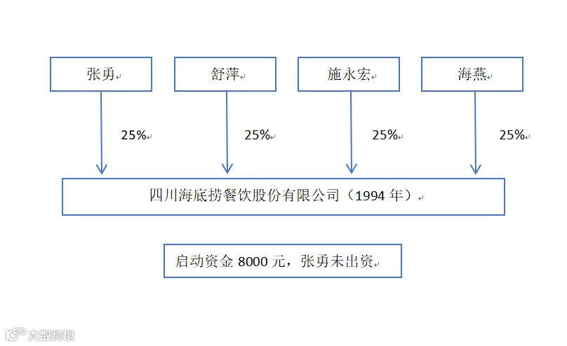 1994年,有四个要好的年轻人,在四川简阳开设了一家只有4张桌子的小火锅店,后来快速发展,成就了今日的海底捞。这四个要好的年轻人,两男两女结成了两对夫妻,他们就是“海底捞”股东张勇夫妇和施永宏夫妇。最初的时候,现任海底捞董事长兼总经理张勇并没有出资,是其他3个年轻人凑了8000元,而这四个人各占了25%的股份。出现了海底捞最初(1994年)的平分股权的股权结构,其股权结构如图1-1所示。