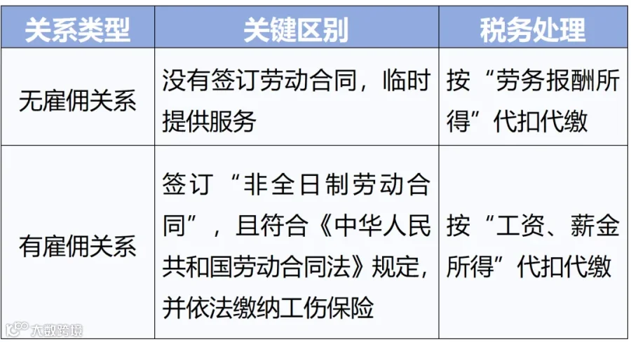 实务中,还有一种不太常见的情况——店家与招用的兼职者签订“非全日制劳动合同”。企业与兼职者签订“非全日制劳动合同”,且符合《中华人民共和国劳动合同法》第六十八条规定(每日工作不超过4小时,每周累计不超过24小时,以小时计酬为主),并依法缴纳工伤保险的,双方存在雇佣关系,兼职者取得的收入按工资、薪金所得处理。