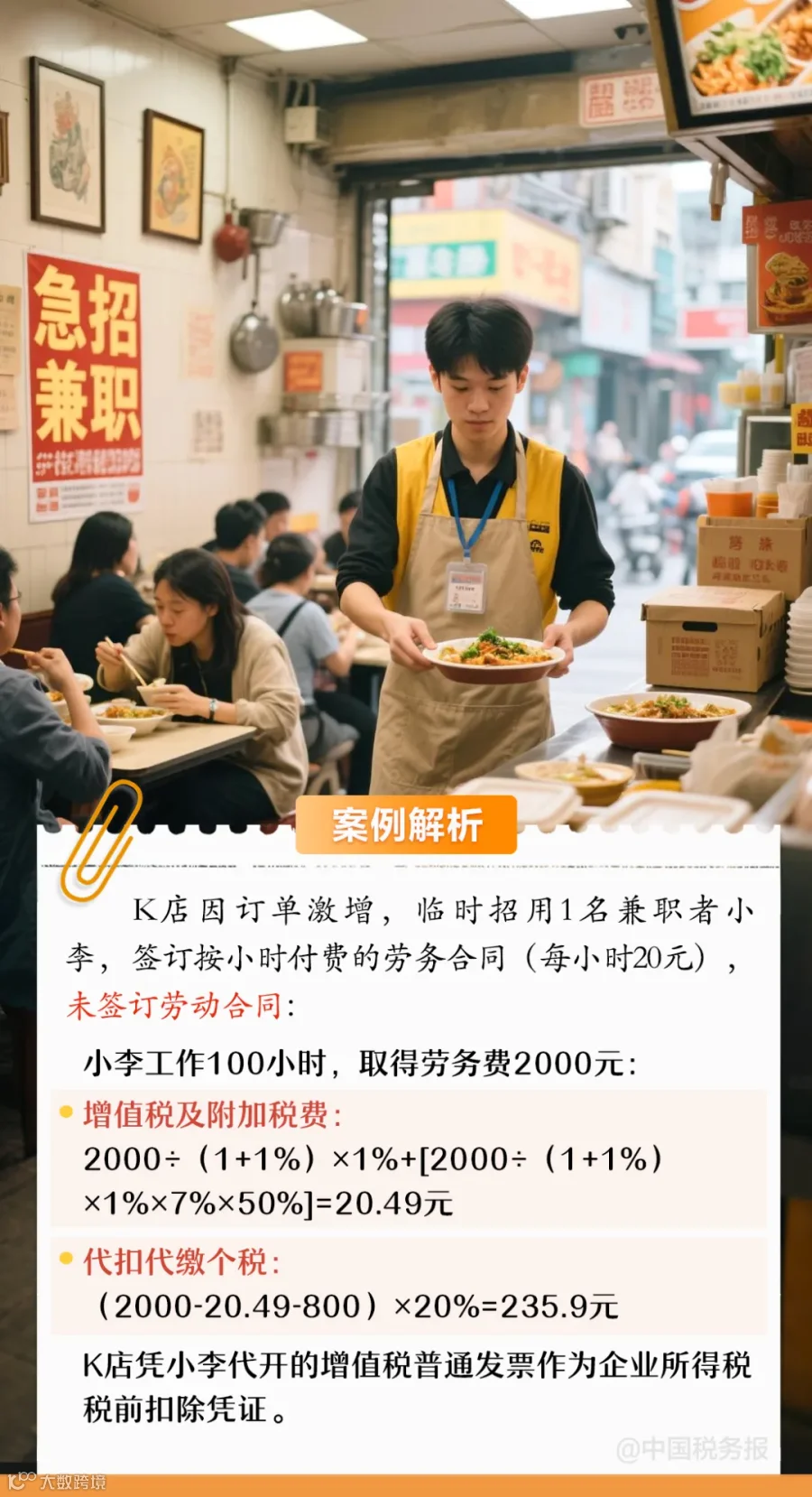 以K店为例,受暑期出游高峰影响,订单量暴增,临时招用1名社会兼职者。以李某为例,李某需要在税务机关缴纳增值税2000÷(1+1%)×1%=19.8(元);因K店位于市区,适用城市维护建设税的税率为7%,则李某需要缴纳城市维护建设税、教育费附加、地方教育附加19.8×7%×50%=0.69(元);李某共需要缴纳增值税及其附加税费20.49元。