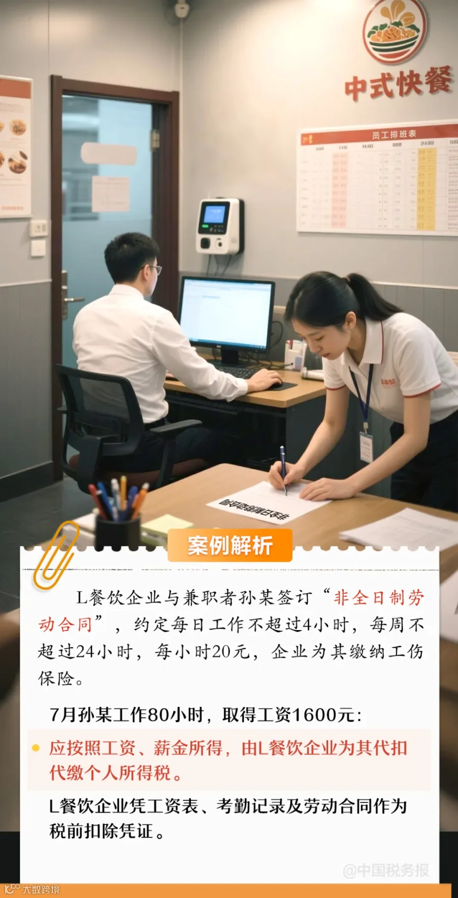 假设L餐饮企业与招聘的兼职者孙某签订“非全日制劳动合同”,明确每天工作不超过4小时,每周不超过24小时,且企业为其缴纳工伤保险,工资按小时计酬,每小时20元,每月结算两次。假设孙某7月共工作80小时,月工资合计1600元。这种情况下,餐饮企业与孙某存在雇佣关系。孙某取得的1600元收入,应按照工资、薪金所得处理,L餐饮企业为其代扣代缴个人所得税。